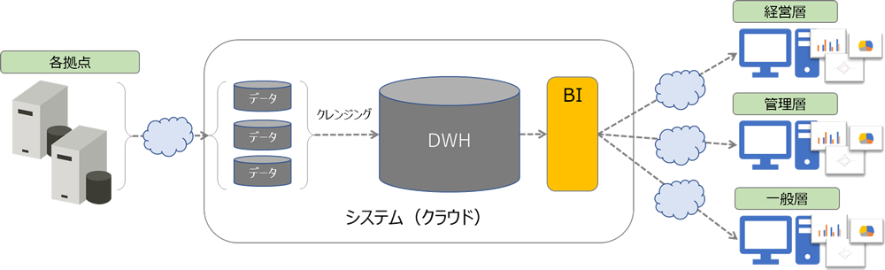 各拠点でバラバラに収集されていたデータを定期的にアプリケーションにてクラウド上にアップし、そのバラバラなデータを分析しやすいデータに自動でクレンジングし統一データがクラウド上に作成される。統一されたデータを元に、会社に関わる全ての人が(経営層、管理層、一般層)、それぞれの視点でBIツールを使って高度で自由な分析を行い、その分析結果にて方向性を決めるデータを中心とした経営が行われる。