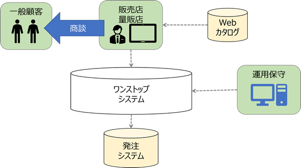 前線の販売員による提案力強化とスピード感のある発注を実現したシステム。本のカタログからWebカタログにする事により提案力が強化され、そこからの発注もWebカタログから社内の発注処理が連携する事によって商品照会~発注処理をワンストップで実現している。また、デバイスフリーも実現しており、時間・場所を選ばないワークスタイルを確立させている。